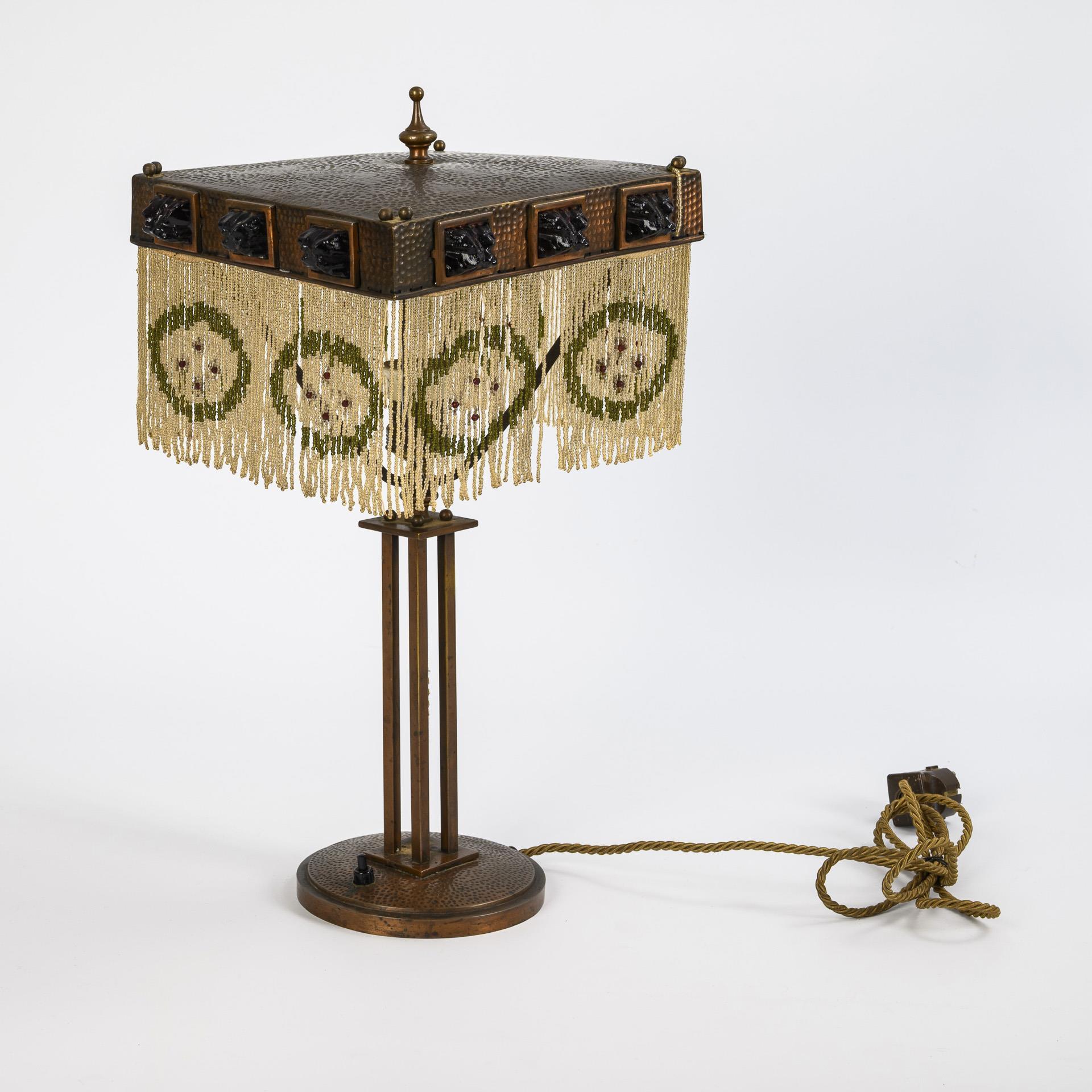 Lampe auf rundem Fuß mit durchbrochenem Pfeilerschaft, von dem vier Stege zu einem quadratischen Schirm führen. An den Kanten des Schirms sind rote Brocken eingesetzt, vermutlich aus Kunstharz. Vom Schirm hängt ein Glasperlenkettenbehang mit Medaillonmuster herab, dieser etwas lückenhaft