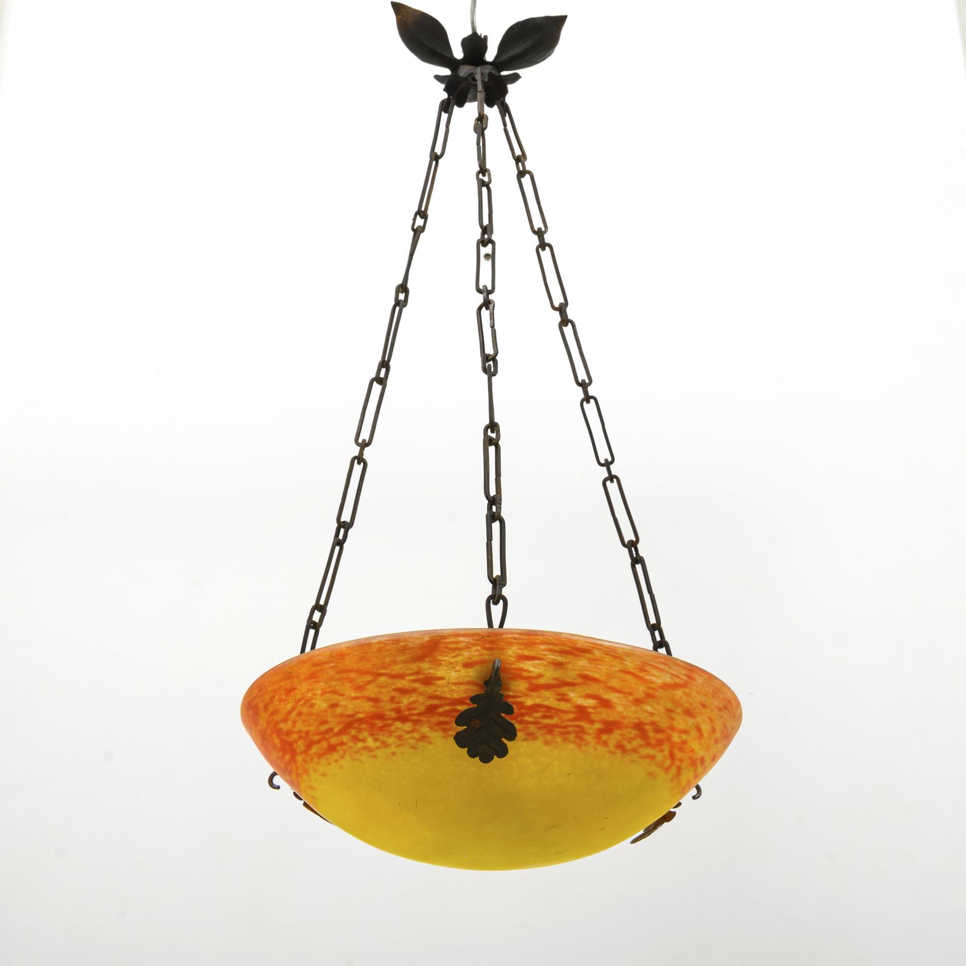 Deckenlampe mit Blattbaldachin und drei schmiedeeisernen Kettenaufhängungen. Die Schale aus farblosem, mattiertem Glas weist Pulvereinschmelzungen in rot, gelb und orange auf und ist an Laubansätzen befestigt