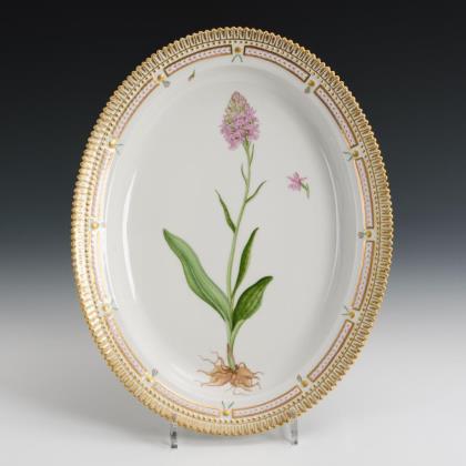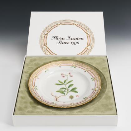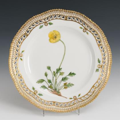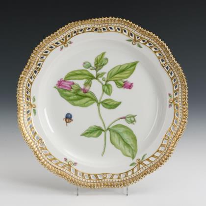 Mehrpassige Teller mit stabdurchbrochener Fahne sowie reicher floraler, teils radierter Goldmalerei auf kobaltblauem Fond, im Spiegel eine Quadratkartusche mit der Darstellung einer figürlichen Szene