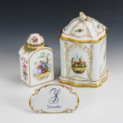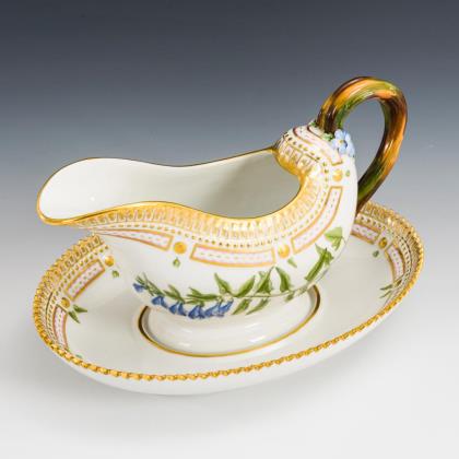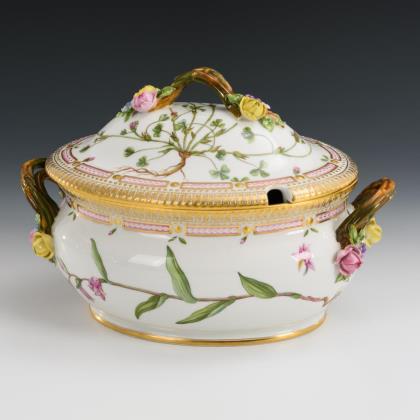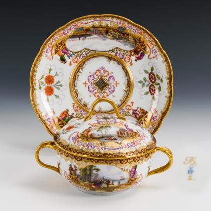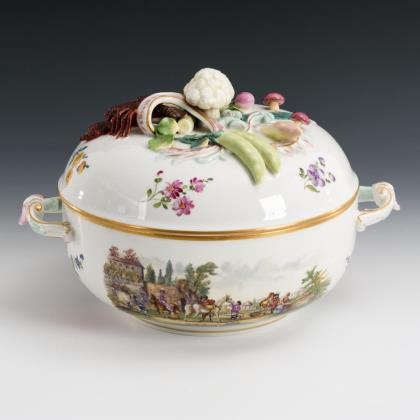 Terrine mit gewundenen Asthenkeln und Astgriffdeckel, mehrpassiges Presentoir. Auf Terrine, Deckel und Presentoir jeweils zwei von Laub- und Bandelwerk umgebene Vierpasskartuschen mit einer Fischerszene sowie der Darstellung von Vergnügungen der höfischen Gesellschaft (z.B. Entenjagd, Blinde-Kuh-Spiel, Hirschjagd). Auf den die Kartuschen flankierenden Konsolen kleine Chinesenfiguren