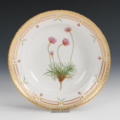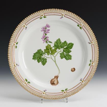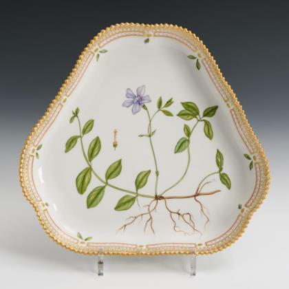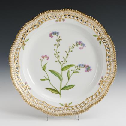 Teller mit durchbrochener Fahne und Zackenrand. Im Spiegel die Darstellung eines Sumpf-Vergissmeinnichts