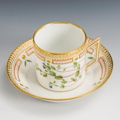Quadratschale mit Blumenmalerei und braunem Rand (21 x 21 cm) sowie Mokkatasse (H 3,5 cm) und Untertasse (Ø 11,5 cm) mit Frucht-, Blumen- und Insektenmalerei