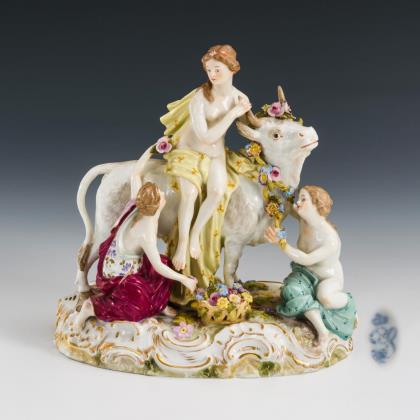 Dreifigurige Gruppe mit der auf einem blütengeschmückten Stier sitzenden Europa sowie zwei vor dem Stier sitzenden Nymphen