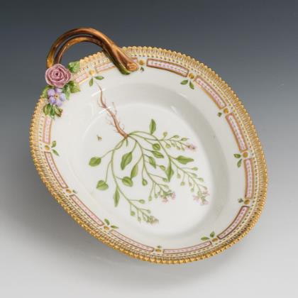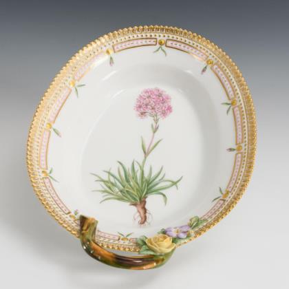 Schale mit korbdurchbrochener Fahne und fünf Rocailleschildern