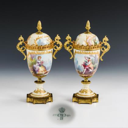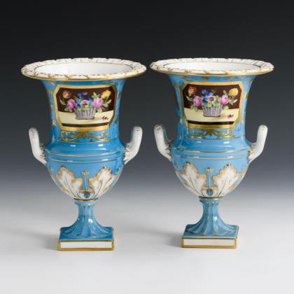 Gefußte Kratervasen mit zwei Henkeln, auf Quadrathplinthe. Hellblauer Fond, schauseitig eine Rechteckkartusche mit der Darstellung eines Blumenkorbes