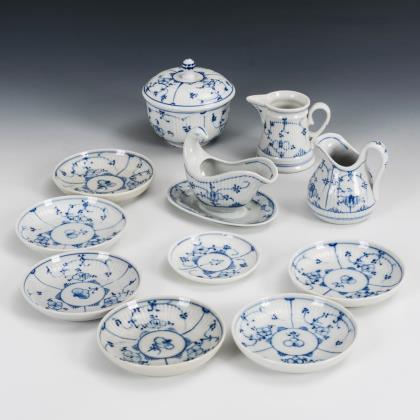 11 Teile. Gebrochen gerippte Wandung. Zuckerdose (H 9 cm), 2 verschiedene Milchkännchen, 1 kleine Sauciere (L 12 cm), 6+1 kleine Teller