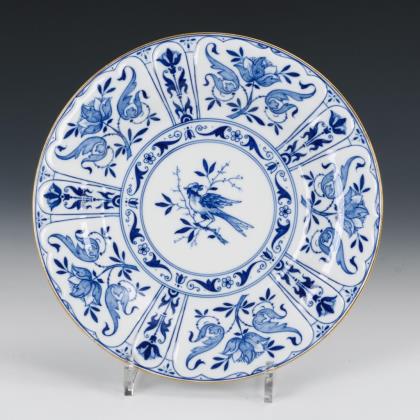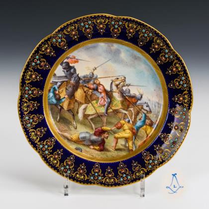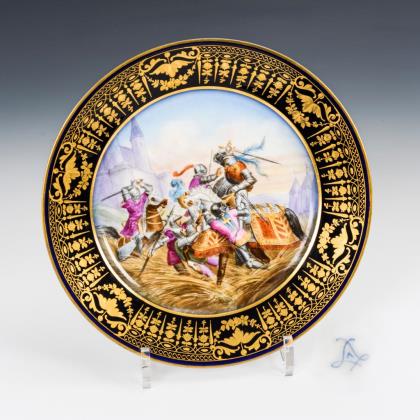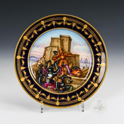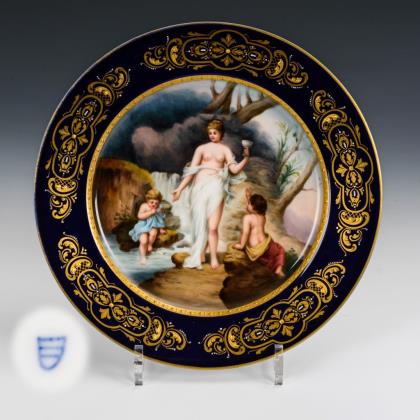 Teller mit Goldrelief- und Juwelenmalerei auf der kobaltblauen Fahne. Im Spiegel die Darstellung einer an einer Quelle stehenden Nymphe mit Pokal sowie zwei Amoretten, unterseitig bezeichnet "Quellennymphe"
