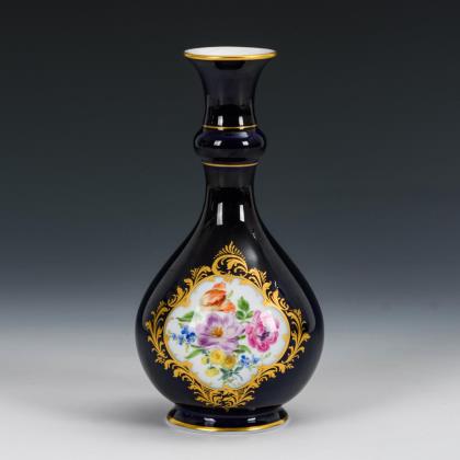 Enghalsvase. Schauseitig eine Vierpasskartusche mit einem Blumenbukett