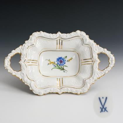 Schale mit zwei Henkeln, Floral- und Rocaillerelief sowie Blumenmalerei mit Kornblume im Spiegel