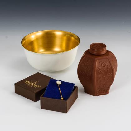 Sechseckige Baluster-Deckelvase aus Böttgersteinzeug (H 9,5 cm), Schale mit Innenvergoldung (Ø 12,5 cm) und Reversnadel mit Schwerterzeichen (L 5,5 cm)
