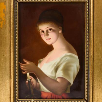 Porzellangemälde: Junge Frau mit Amorknaben