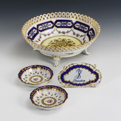 Schale mit 4 Füßen und Durchbruchrand (Ø 22 cm), 2 Nussschälchen (Ø 9,5 cm) und Firmenaufsteller Potschappel (L 11,5 cm)