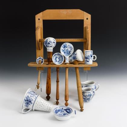 10 Teile. 2 Kännchen (H 7,5 und 8,5 cm), 1 Sieb (H 16 cm), 1 kleiner Messbecher, 1 Fleischklopfer, 1 Krautstampfer, 1 Teller, 1 Löffel, 1 Teigrädchen und 1 Kellenlaffe. Dazu Wandregal aus Holz