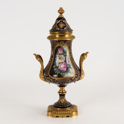Vase mit bronzemontierten Henkeln, Deckel und Stand. Schauseitig eine Kartusche mit einem Blumenbukett