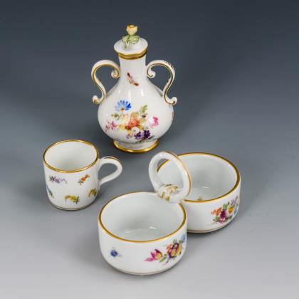 Flakon mit zwei Henkeln (H 7,5 cm), Miniaturtasse (H 3 cm) und Doppelsaliere (L 9,5 cm)