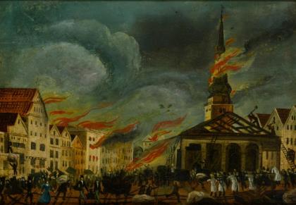 Zeitgeschichtlich interessante Darstellung des Brandes mit zahlreichen Menschen auf dem Platz