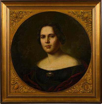 Porträt einer jungen Frau im Kleid mit Brosche und im gemalten ovalen Bildausschnitt