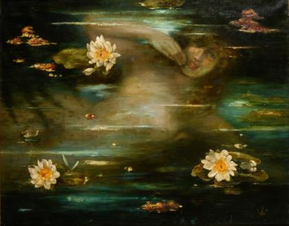 Junge Frau im Teich unter Wasser mit schwimmenden Seerosen