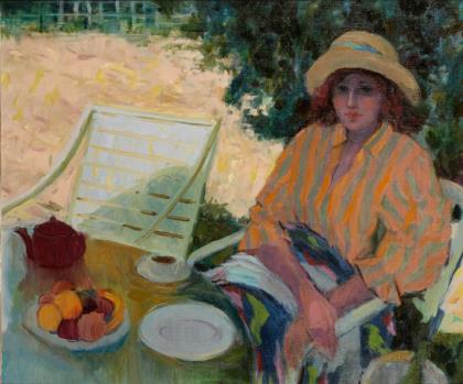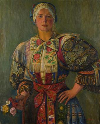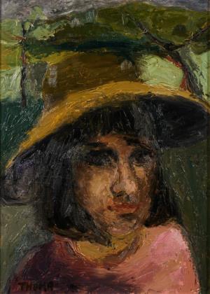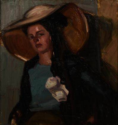 Bildnis einer jungen Frau mit breitem Hut und weißen Rosen