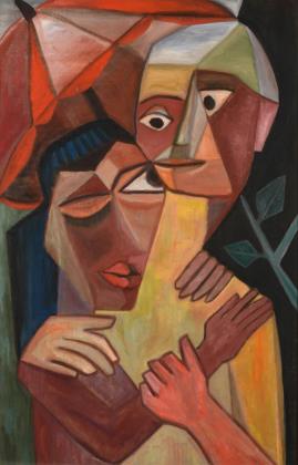 Sich innig umarmendes Liebespaar unter Sonnenschirm