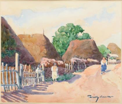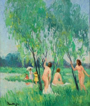 Undeutlich signiert: Badende auf einer Frühlingswiese