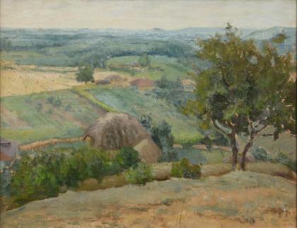Blick von einem Hügel hinab über die Felder zum Gehöft in weiter bergiger Landschaft