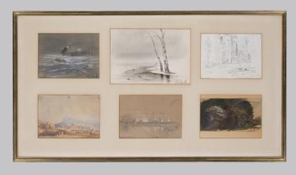5 Landschaften, 1 Schlachtenszene: Russisch-türkischer Krieg. Passepartout. Schlichter verglaster, leicht defekter Rahmen
