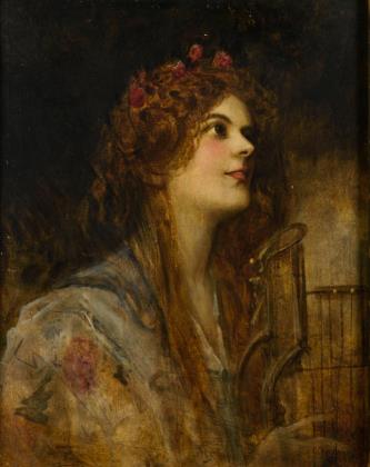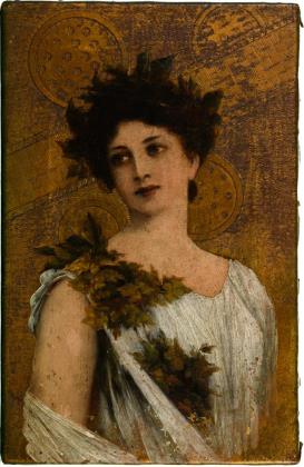 Junge Frau in antikisierendem Gewand mit Lorbeerkranz vor ornamental gestaltetem, goldenem Hintergrund