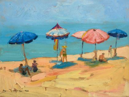 Personen am warmen Sandstrand unter Sonnenschirmen mit Blick aufs Meer
