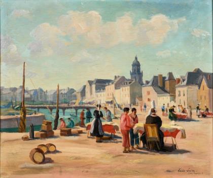 Helles Sonnenlicht über den Marktständen der französischen Gemeinde am Atlantik