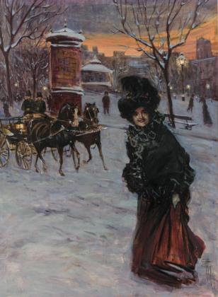 Impressionistisch gemalte Winterlandschaft mit schnell galoppierenden Pferden in der Sonne