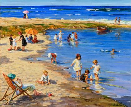 Viele Menschen in der Mode um 1900 bei hellem Sonnenschein am Strand