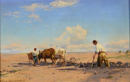 Zwei Bauern im hellen Licht der Sonne auf dem Acker in weiter karger Landschaft unter blauem Himmel