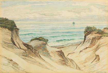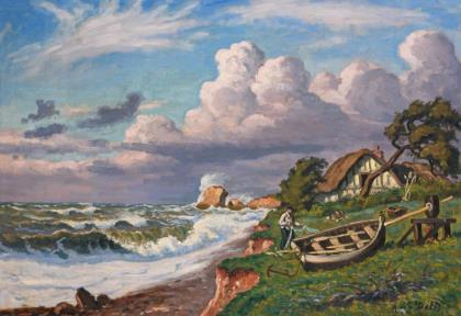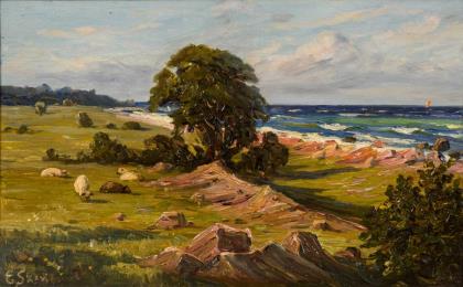 Undeutlich signiert: Dänische Küstenansicht mit Schafen