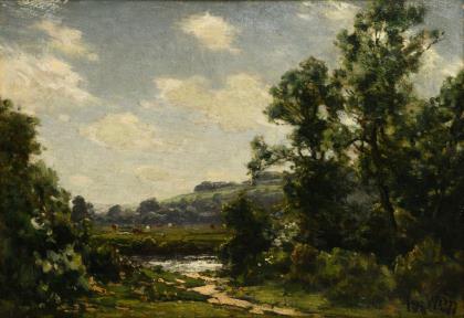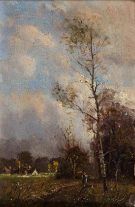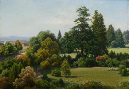 Qualitätvolle Landschaftsdarstellung mit Staffagefigur im Park an einem sonnigen Tag