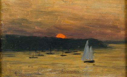 Segler auf dem Wasser bei untergehender Sonne am Horizont