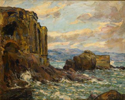 Imposante stürmische Küstenlandschaft mit einer Ruine auf den steilen Felsen