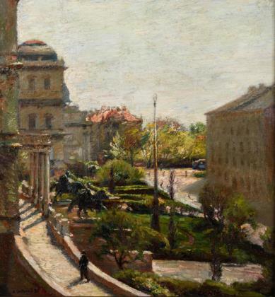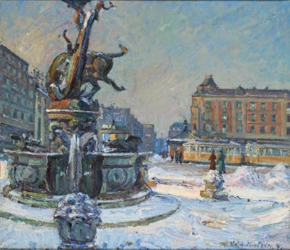 Impressionistisch gemalte Ansicht des Platzes mit Brunnen im Winter bei Sonnenschein