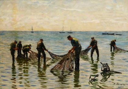 Die Fischer beim Einholen der Netze im seichten Meerwasser