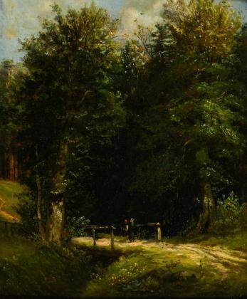 Waldweg mit Brücke und gebeugt gehender Bäuerin vor dunklen Bäumen