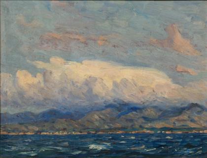 Impressionistisch gemalter Blick aufs ruhige Meer unter leicht wolkigem Himmel