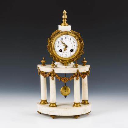 Weißer Marmor, Messing. Demi-Lune-Portaluhr mit 4 Säulen, Festons und Vasenbekrönung