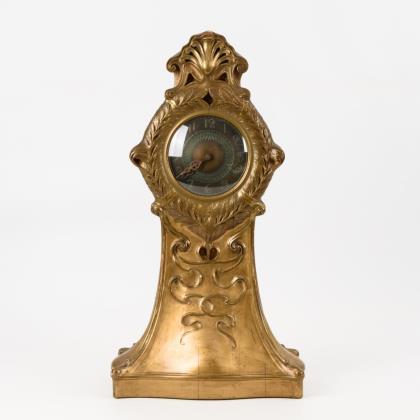 Holz, bronziert. Taillierter Korpus mit Muschelbekrönung und Lorbeerkranz, stiltypische Schnitz- und Reliefzier