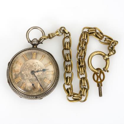 Silber geprüft. Uhrenkette mit 2 Schiebern, Uhrenschlüssel und Zierbehang, Karabinerschraubverschluss