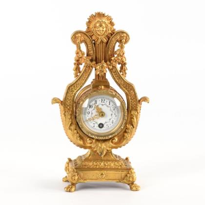 Metallguss, bronziert. Lyra-Uhr im Louis-Seize-Stil mit bekrönendem Sonnenkopf, Festonbehängung und quadratischem Sockel mit Tatzenfüßen
