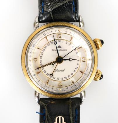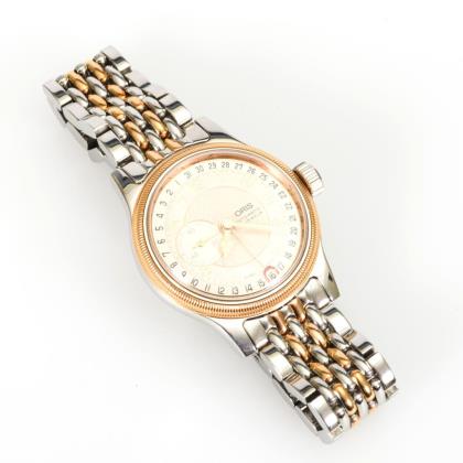 750 RG, Feingehaltsstempel, Firmenmarke ALS gepunzt. "Lucia"-Gehäuse mit ligiertem Monogramm "OW", goldener Staubdeckel. An Doublé-Gliederkette mit Karabiner und Federring