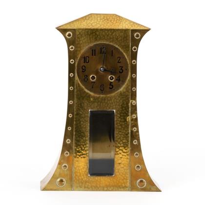Verschiedene Hölzer, Messing, Alabaster, teils farbig staffiert. 4-säulige Portaluhr mit verspiegelter Rückwand und bekrönender Uhrentrommel mit Giebeldach und Vase