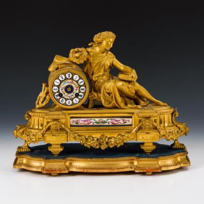 Bronze, farbig bemalte Keramik. Breiter Sockel im Louis Seize-Stil mit der sitzenden Muse Euterpe neben Aulos, Schriftrolle, Buch und Rosenkranz. Auf vergoldetem Holzsockel mit blauem Stoffbezug