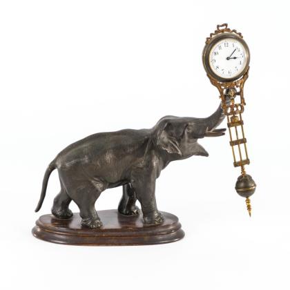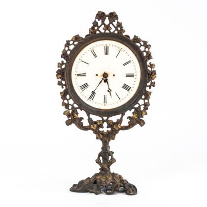 Eisenguss, brüniert und teilbronziert. Großes Zifferblatt in floral verziertem und durchbrochen gefertigtem Ständer mit Dreiecksfuß