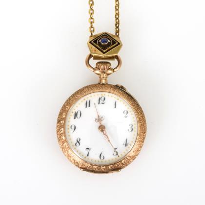 585 RG, Schweizer Beschauzeichen, Feingehaltsstempel, Firmenmarke gepunzt. Ziseliertes Gehäuse mit farbig emaillierter Blume und leerer Wappenkartusche. Staubdeckel aus Metall. An ergänzter 585 GG gepunzter Gliederkette mit Schieber